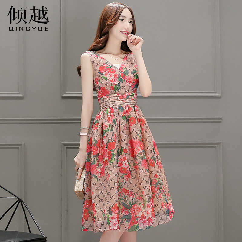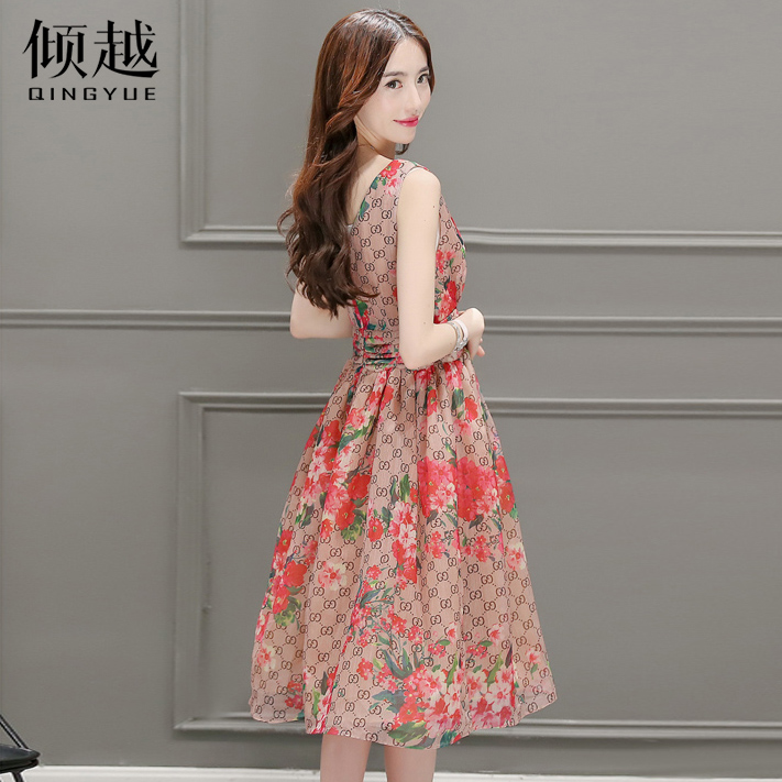 傾越2017夏無袖雪紡連衣裙修身裙子碎花背心裙波西米亞長裙沙灘裙