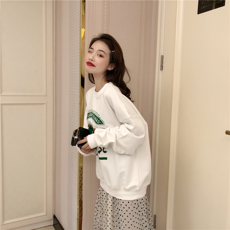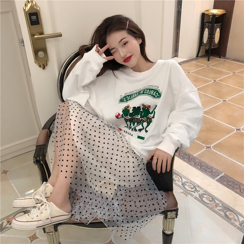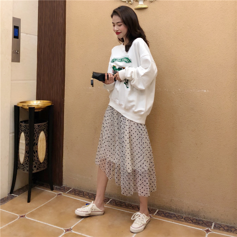 / 秋冬新款百搭印花衛衣時尚套裝網紗波點中長款百褶裙chic兩件套女