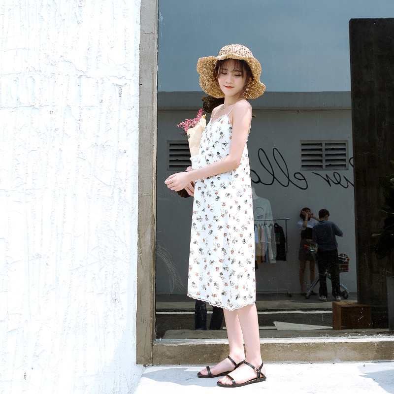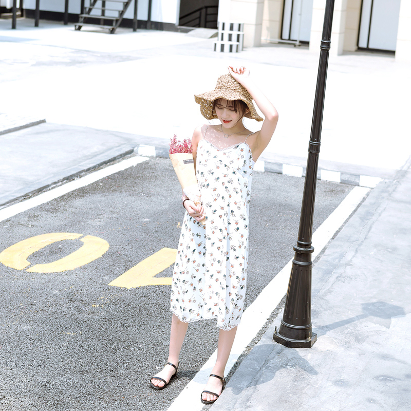/ 夏季新款女裝韓版中長款吊帶白色小清新碎花復古雪紡連衣裙潮