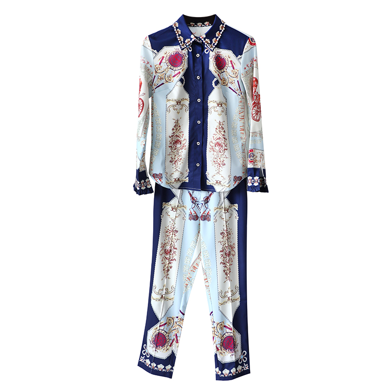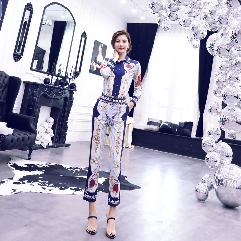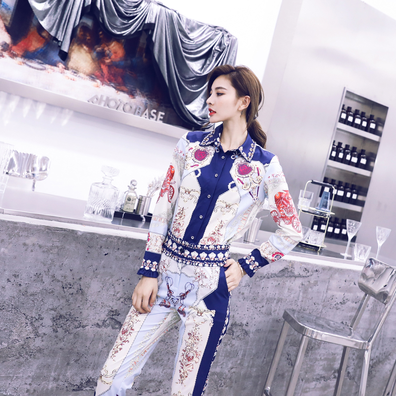 / 時尚夏季網紅長袖襯衫女套裝2018新款名媛印花九分褲氣質兩件套潮