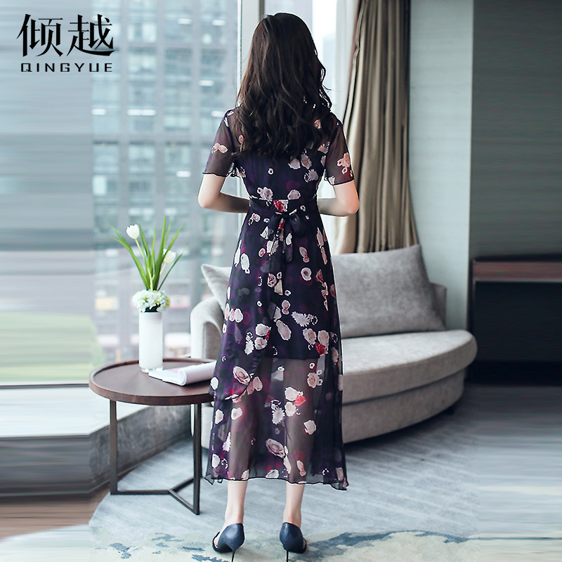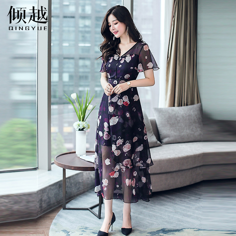 / 印花雪紡連衣裙女夏2017新款韓版透視顯瘦短袖氣質V領大擺長裙子