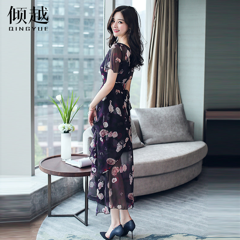 印花雪紡連衣裙女夏2017新款韓版透視顯瘦短袖氣質V領大擺長裙子