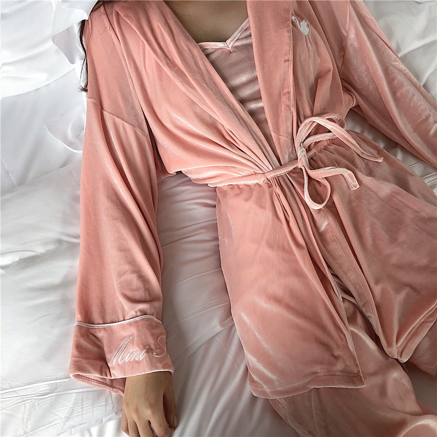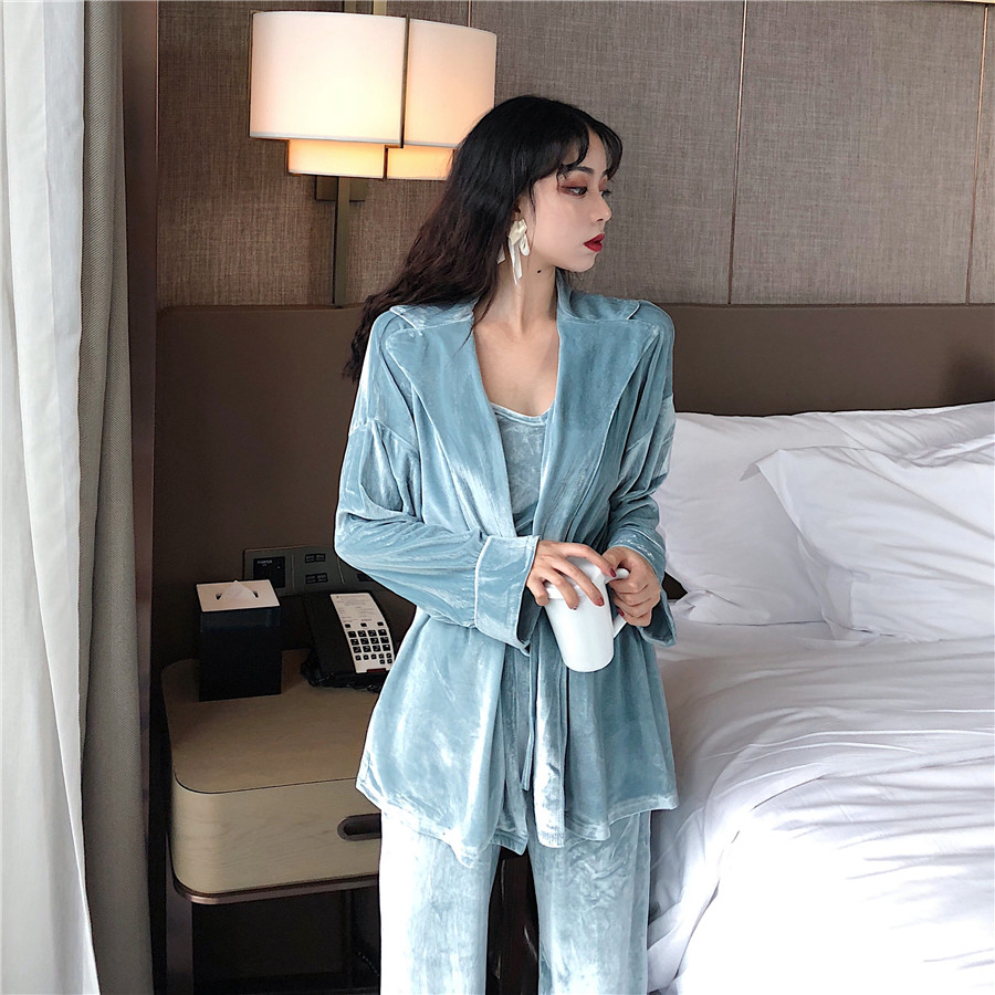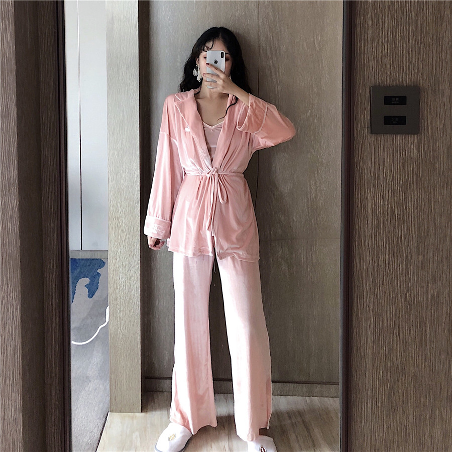 / 金絲絨性感吊帶松緊抽繩睡袍闊腿長褲三件套睡衣舒適家居服套裝潮