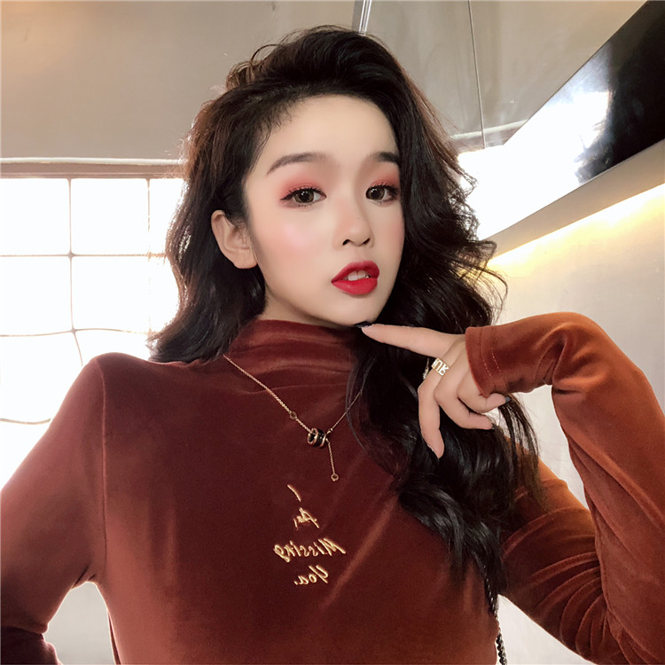 秋冬刺繡半高領新款韓版上衣女修身顯瘦chic風絲絨百搭打底衫T恤