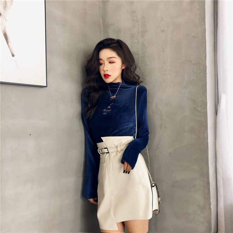 / 秋冬刺繡半高領新款韓版上衣女修身顯瘦chic風絲絨百搭打底衫T恤