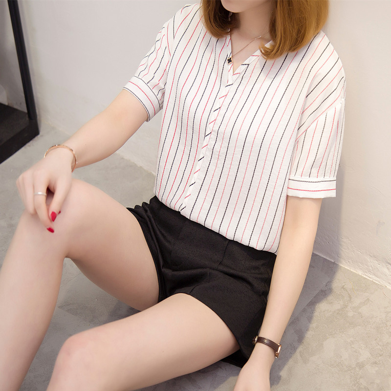 / 條紋襯衫女夏短袖上衣寬松時尚韓版打底衫V領春裝女裝新款潮