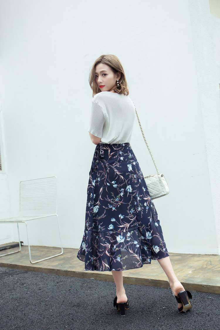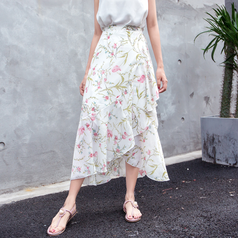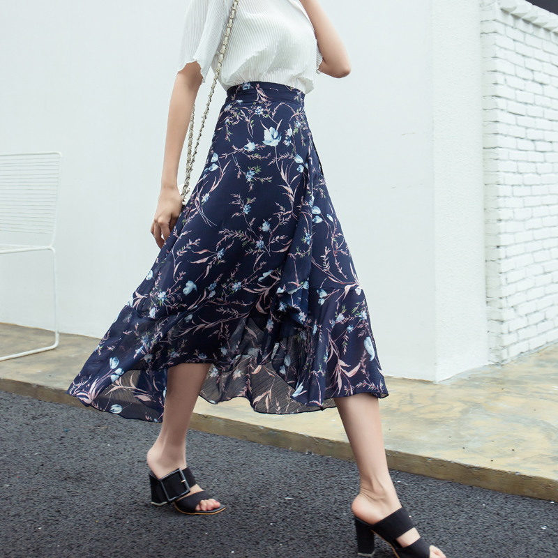 / 韓版雪紡不規則一片式半身裙中長款系帶高腰開叉顯瘦碎花荷葉邊夏