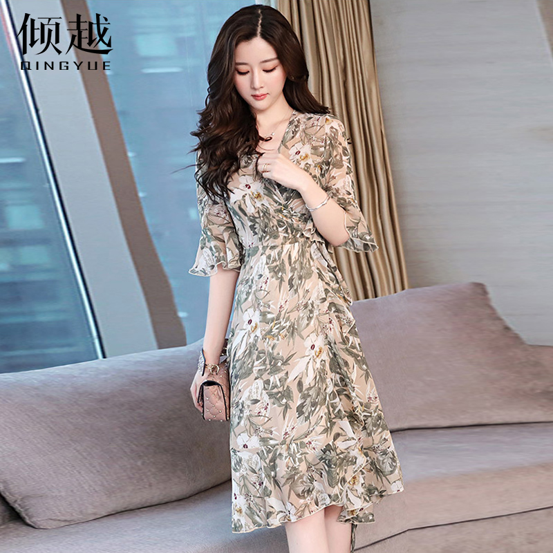 連衣裙女夏2017新款雪紡印花荷葉邊裙喇叭袖v領顯瘦系帶氣質a字裙