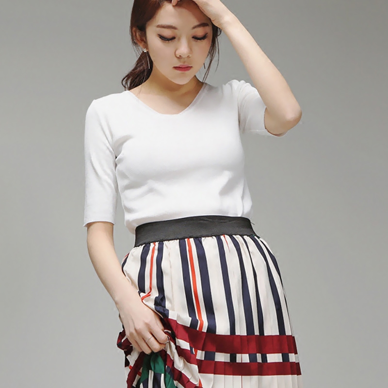 針織短袖女夏冰絲v領純色修身白色t恤女薄新款韓版百搭打底衫