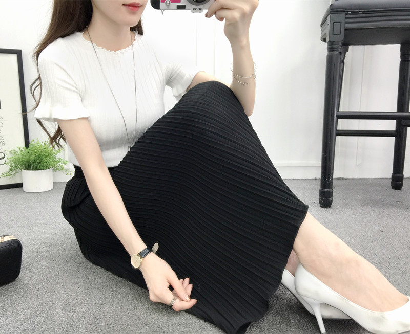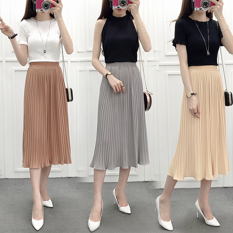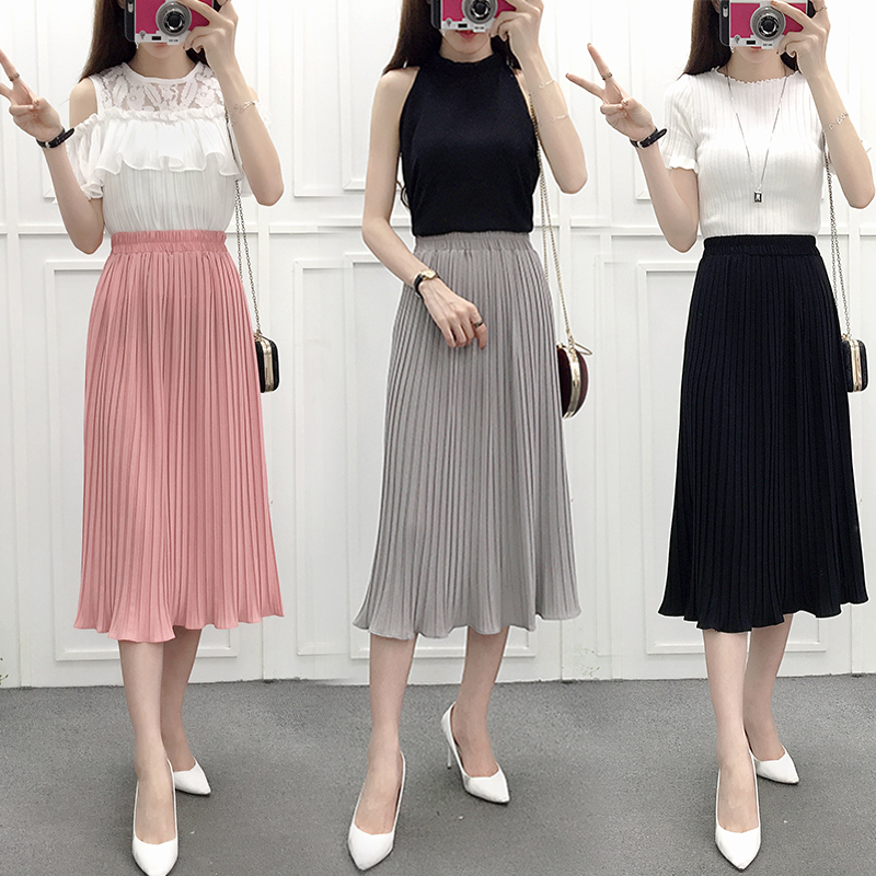 / 韓版夏季高腰中長款百褶裙半身裙女荷葉邊松緊腰雪紡裙A字裙長裙