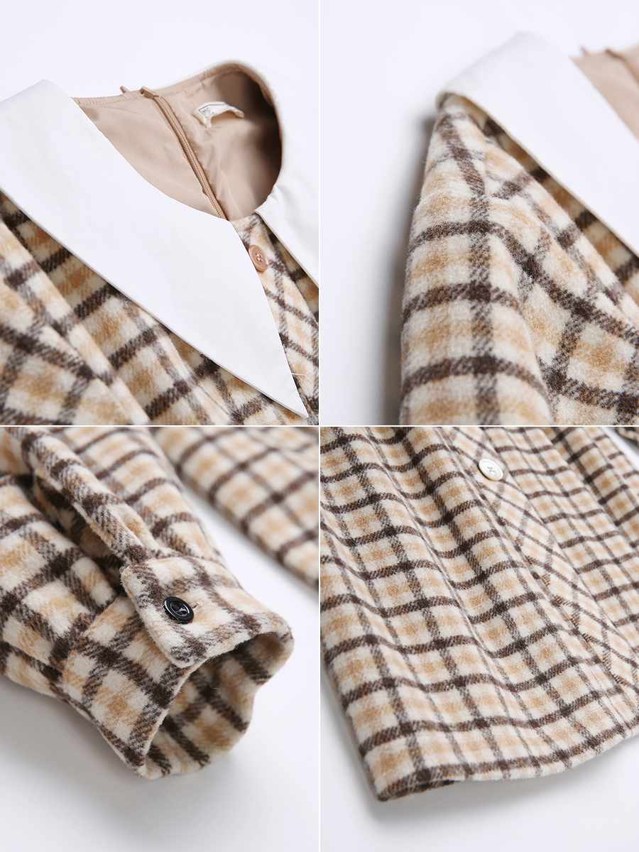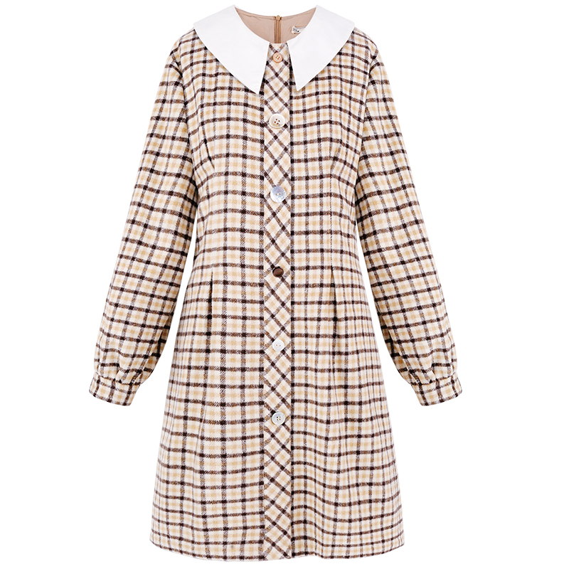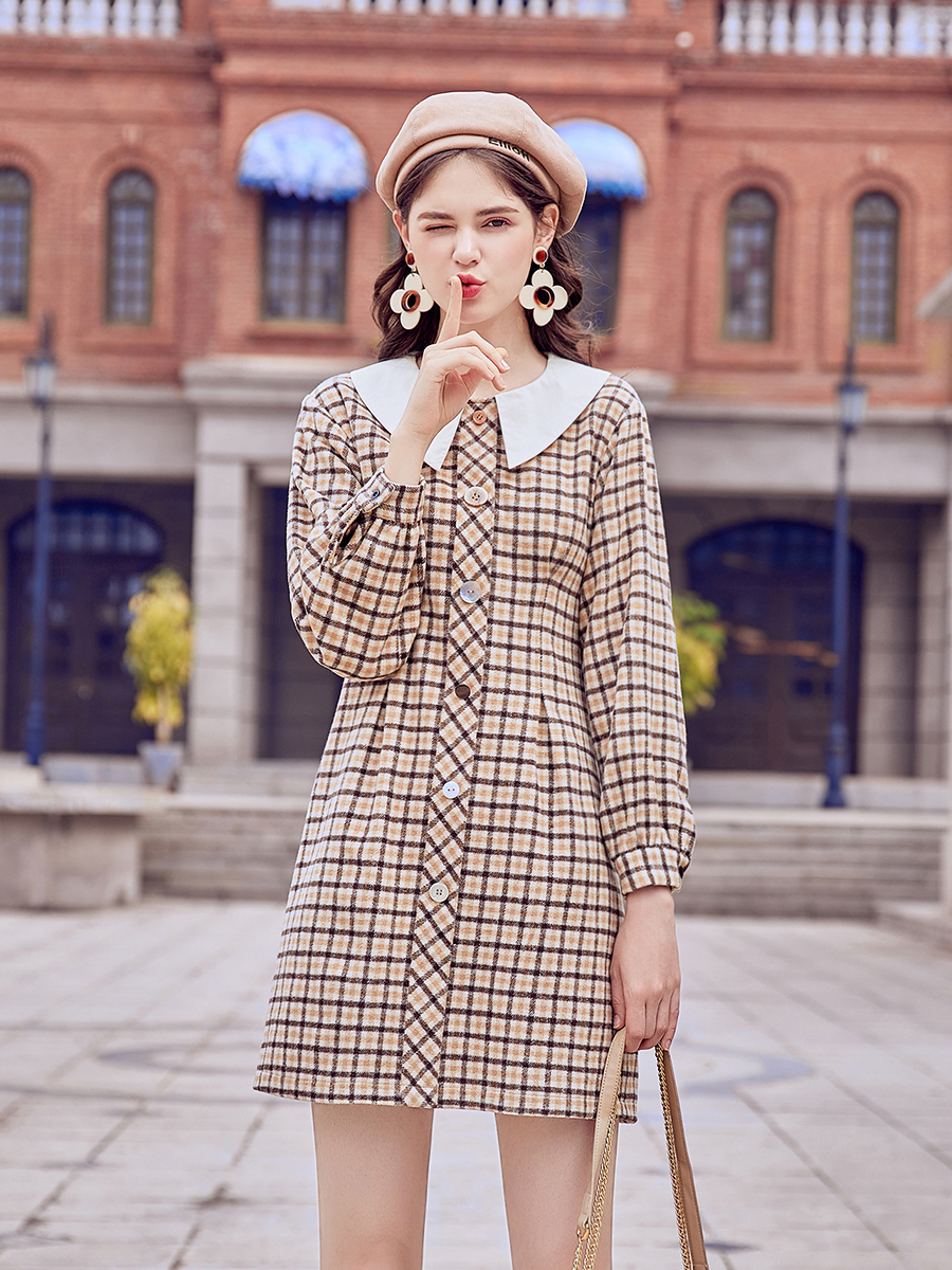 MG小象長袖毛呢連衣裙女秋裝2018新款中長款學生收腰顯瘦格子裙子