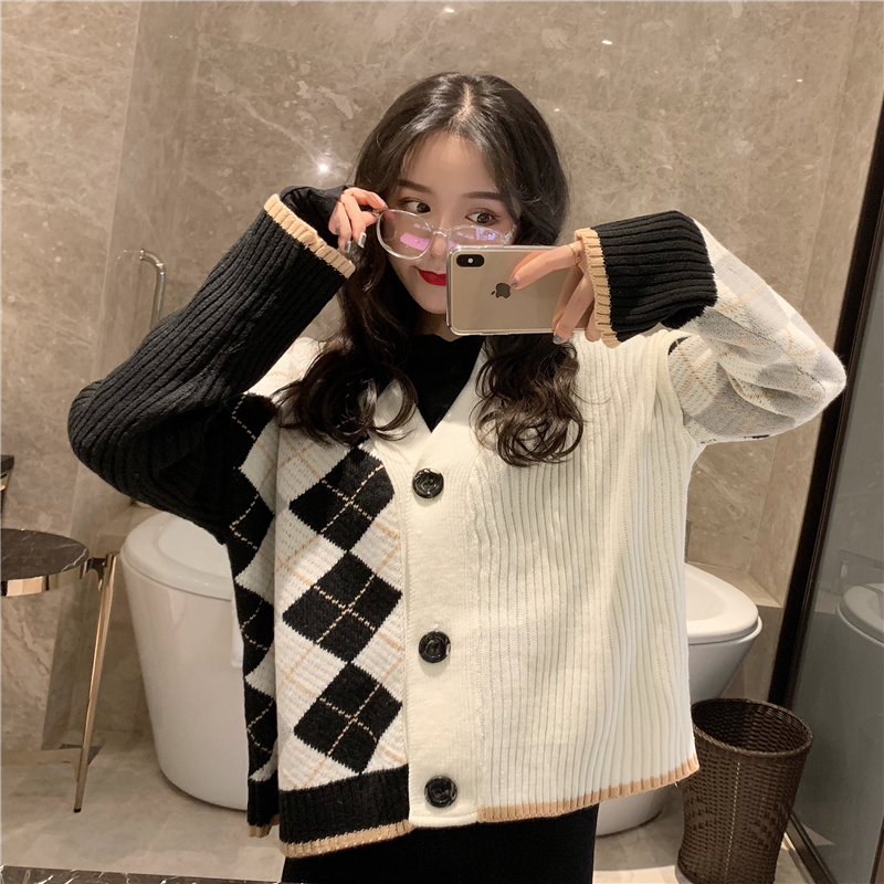 / 秋冬季新款chic百搭長袖格子慵懶風網紅毛衣針織外套女寬松開衫潮