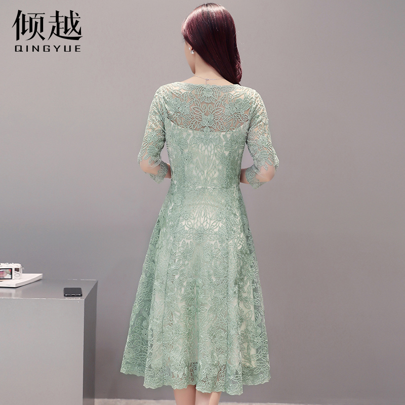 / 傾越2017春季新款韓版鏤空蕾絲裙修身中長款A字七分袖套頭連衣裙