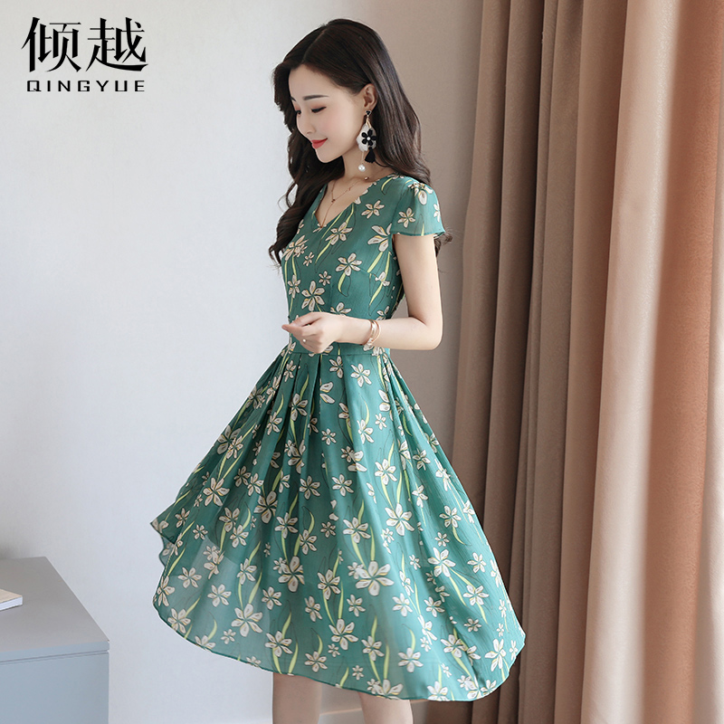 / 2017夏裝新款短袖收腰顯瘦氣質淑女v領碎花高腰雪紡連衣裙女夏潮