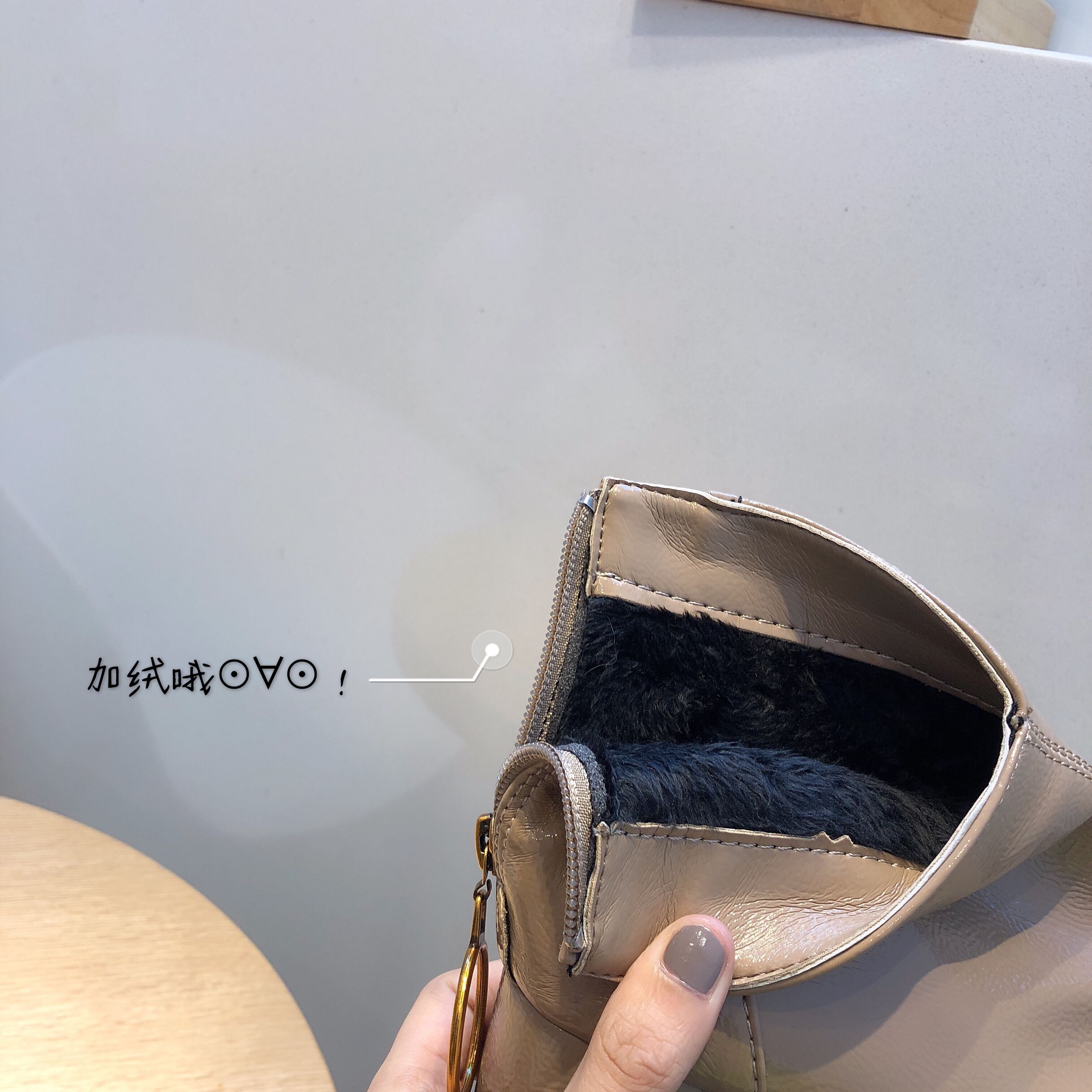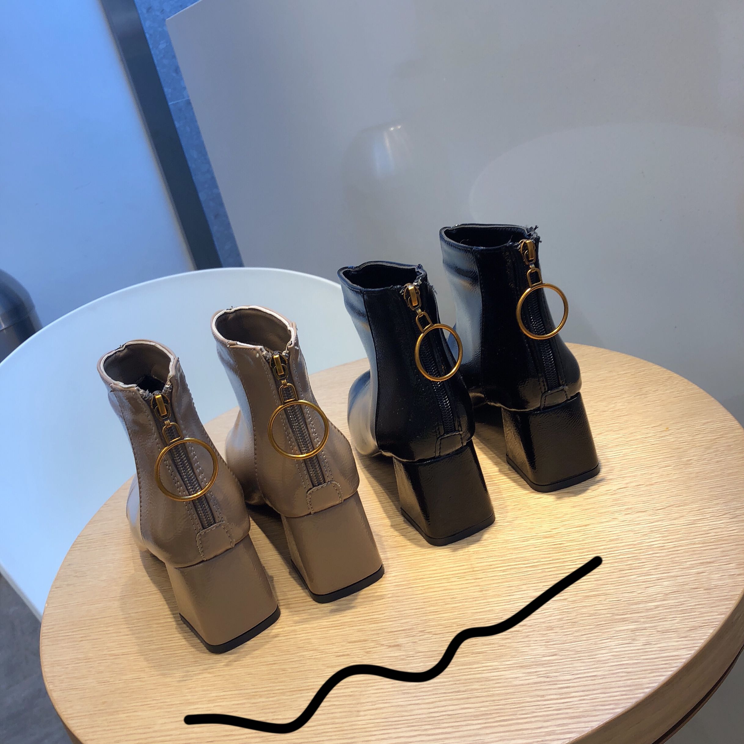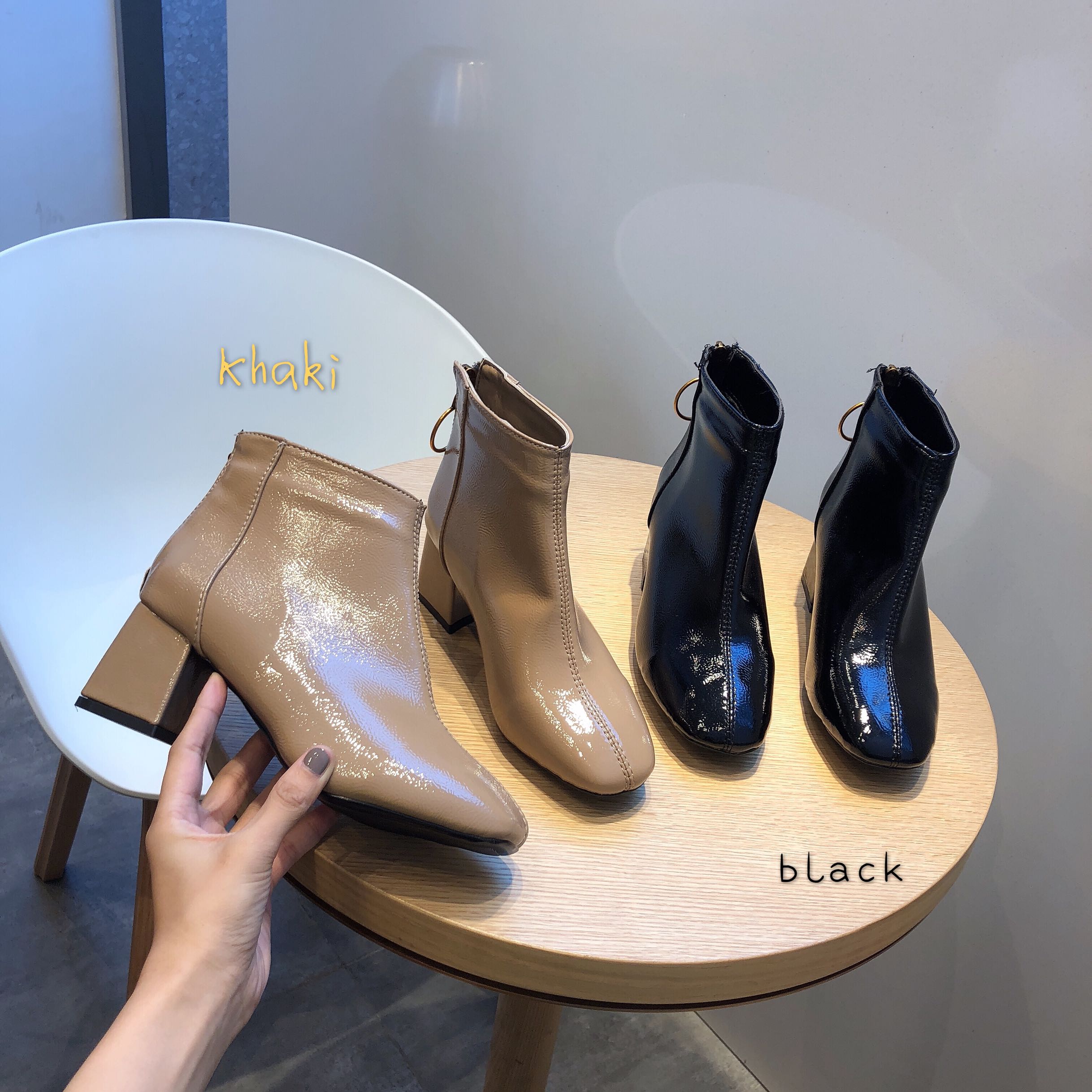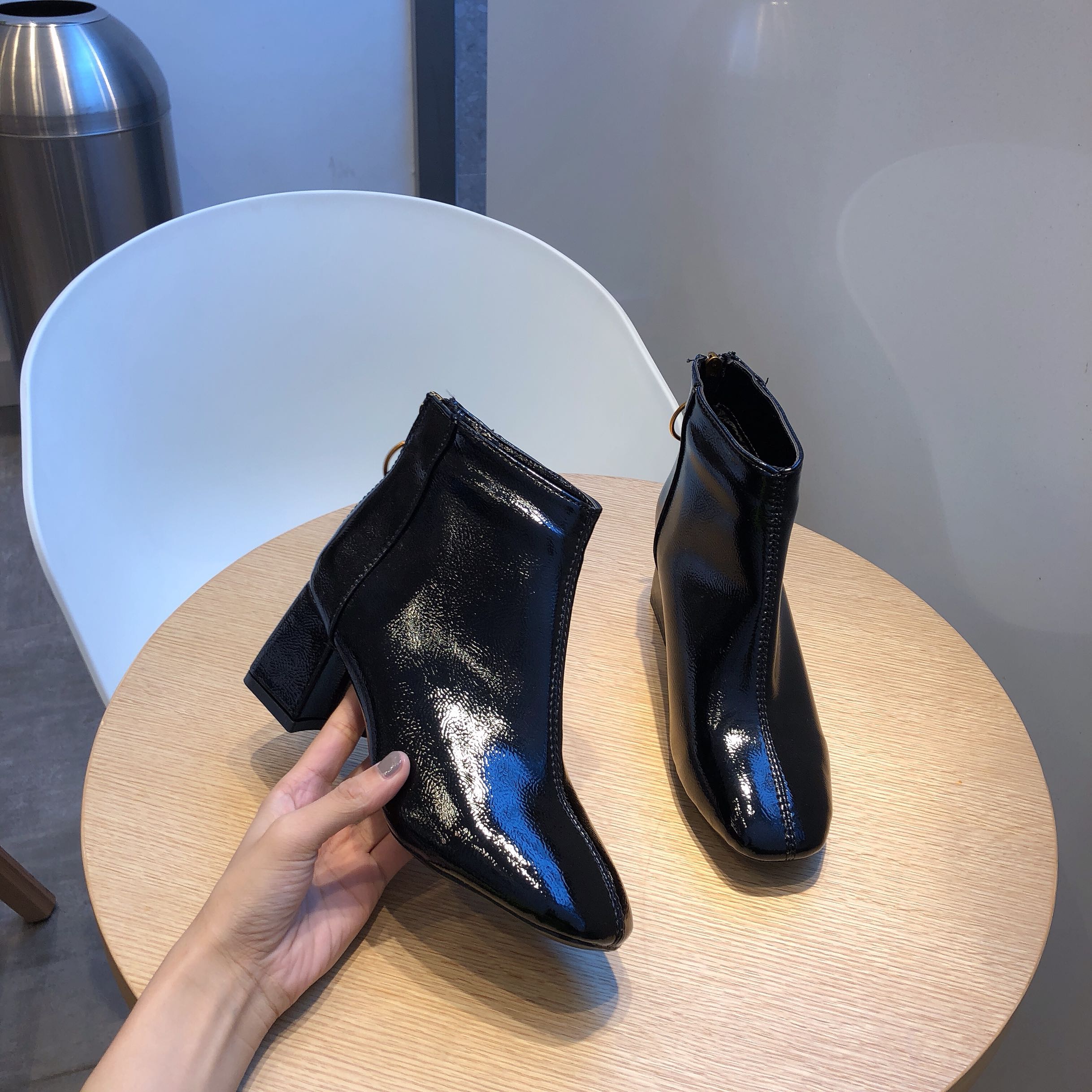 網紅歐美新款chic時尚冬方頭百搭漆皮粗跟高跟女瘦腿短靴及踝靴潮