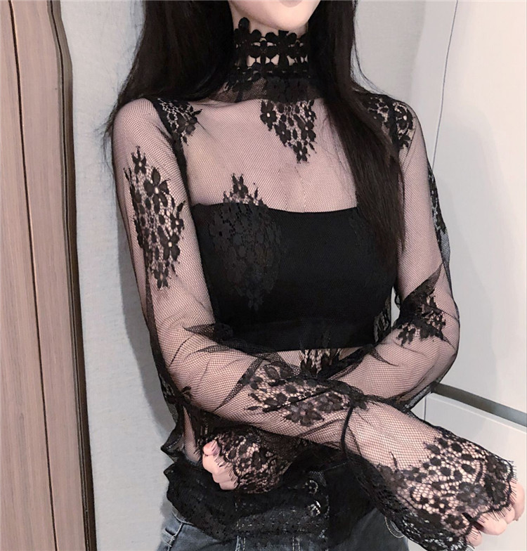 / 小性感氣質蕾絲衫新款秋冬時尚百搭鏤空高領透明網紗內搭上衣潮