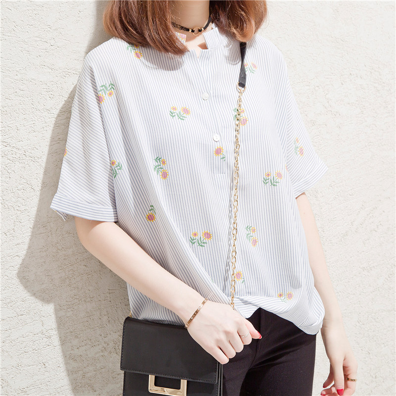 夏裝新款女裝港味條紋襯衫女短袖甜美chic上衣小清新韓范寬松