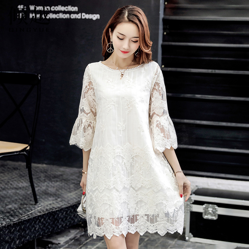 傾越歐根紗連衣裙2017春季新款韓版女裝寬松七分喇叭袖蕾絲短裙子