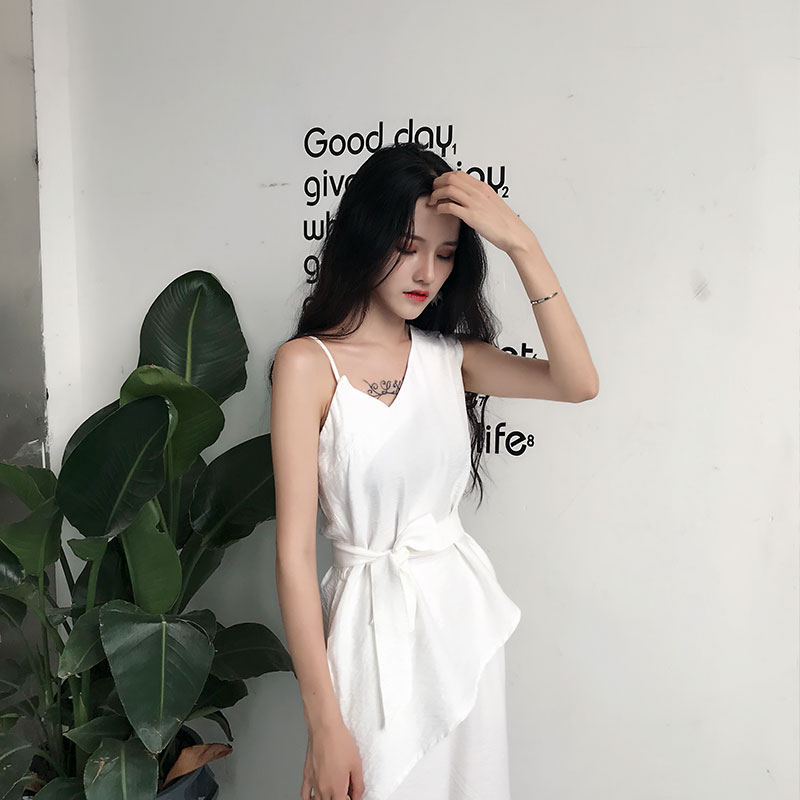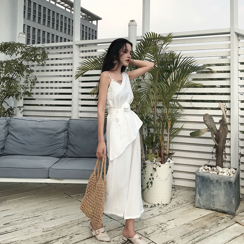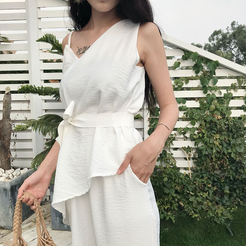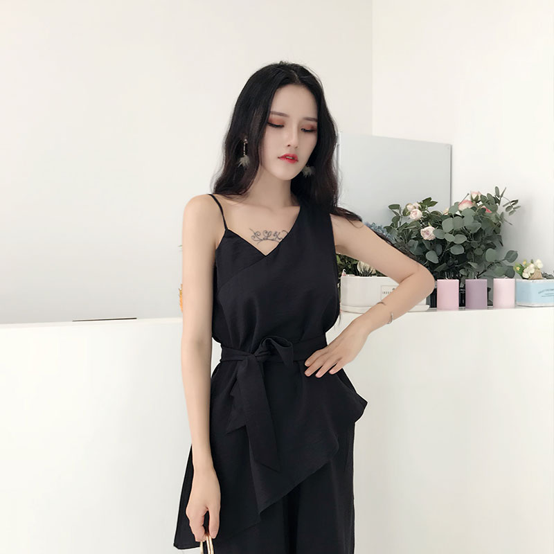 chic風不規則肩吊帶設計感上衣高腰闊腿寬松九分褲時髦套裝兩件套